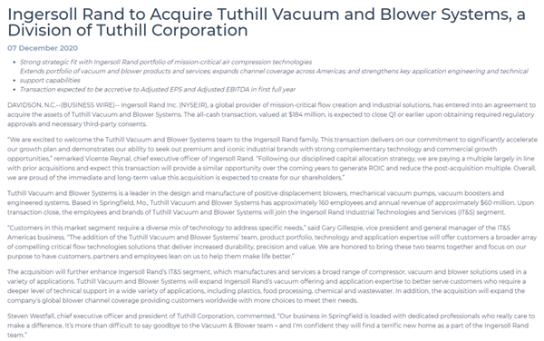 泰悉爾真空和鼓風機系統(tǒng)公司是設(shè)計和制造容積式鼓風機、機械真空泵、真空助力器和工程系統(tǒng)的領(lǐng)導者。泰悉爾真空和鼓風機系統(tǒng)公司總部位于密蘇里州斯普林菲爾德,擁有約160名員工,年收入約6000萬美元。交易完成后,泰悉爾真空和鼓風機業(yè)務(wù)的員工和品牌將加入英格索蘭工業(yè)技術(shù)與服務(wù)(IT&S)部門。
