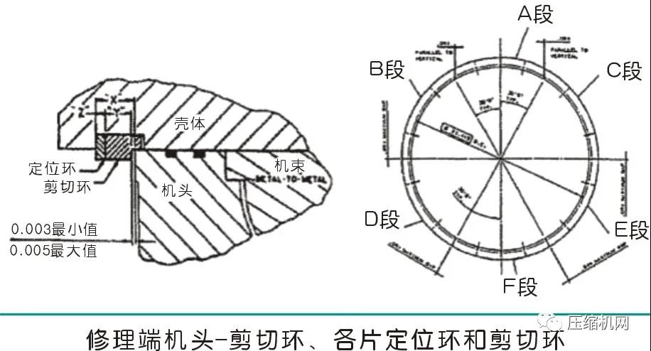 ②用測深微米表測量,從機殼的端面到吸氣端機頭之間的間距,取圓周均布四處測量尺寸,并加以記錄。以便在回裝機束總裝件時的定位尺寸( 0.0762-0.1270毫米),才能將剪切環(huán)和定位環(huán)片段裝配到機殼的環(huán)形套筒中。