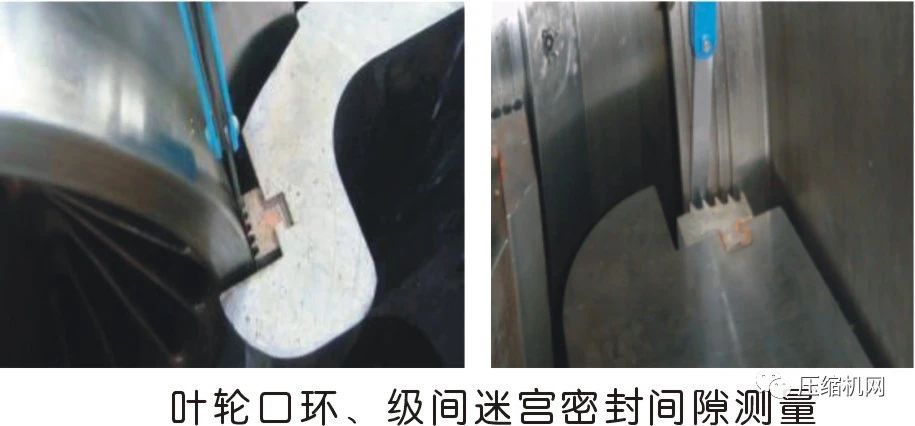 用抬軸法(可傾瓦)配合塞尺測量徑向軸承間隙,然后拆除徑向軸承;注意徑向軸承一旦拆除后,不允許進行盤車,否則各級氣封會受到損害。