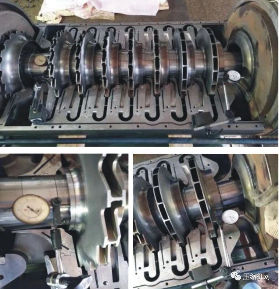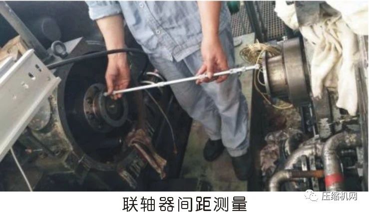 在聯(lián)軸器拆下后,用推軸法測量得的壓縮機軸竄量,同時檢查測量軸對中情況,作為原始拆卸數(shù)據(jù)記錄。