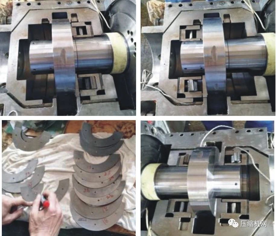 ①止推瓦拆卸前要注意兩道O型圈的位置,并注意儀表線的穿出孔位置,止推瓦的背部有調(diào)節(jié)墊片,用螺絲固定于止推瓦背部。通過調(diào)節(jié)這個墊子的厚度,可以完成軸竄量的調(diào)節(jié)。