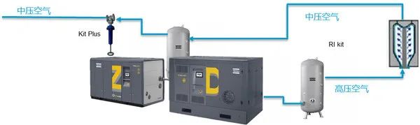 · 組合使用兩種壓縮技術(shù),分別應(yīng)用于其優(yōu)勢(shì)壓力段。通過(guò)Z的無(wú)油螺桿技術(shù),可以把壓力提高到7~10 bar g,供旋蓋、貼標(biāo)、碼垛等中壓用氣;通過(guò)無(wú)油活塞的技術(shù),把壓力從7~10 bar g 增壓到30~40 bar g,滿足吹塑工藝的用氣壓力要求;取代傳統(tǒng)繁冗的兩套系統(tǒng)裝置。