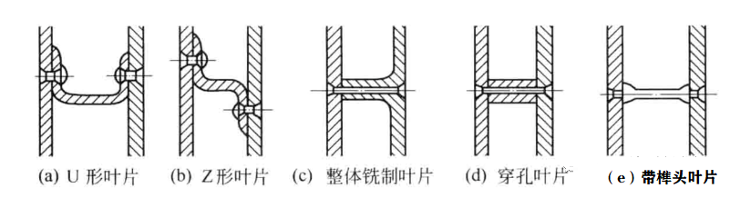 根據(jù)加工方法葉輪可以分為鉚接型、焊接型和整體型。鉚接型葉輪分為一般鉚接和整體銑制鉚接。一般鉚接葉輪是早期壓縮機常采用的方法,葉片常用鋼板壓制成型,分別與輪盤、輪蓋鉚接一起。葉片的形式可以是U形、Z形截面、穿孔葉片和帶有榫頭的葉片等(圖9)。U形和Z形葉片好鉚,是常用形式,但葉片有折邊,增加流動阻力和葉輪的附加重量,離心負荷加大。穿孔葉片因鉚釘要從葉片中貫穿,常常不得不增加葉片的厚度,影響氣體流動,而且鉆長孔也較困難。帶榫頭葉片厚度可以減薄,但對葉片制造要求高,而且榫頭一旦破壞,就得更換整個葉片。一般鉚接比整體銑制鉚接材料利用率高,但強度低,多用在低中壓壓縮機中葉片比較寬的情況下。