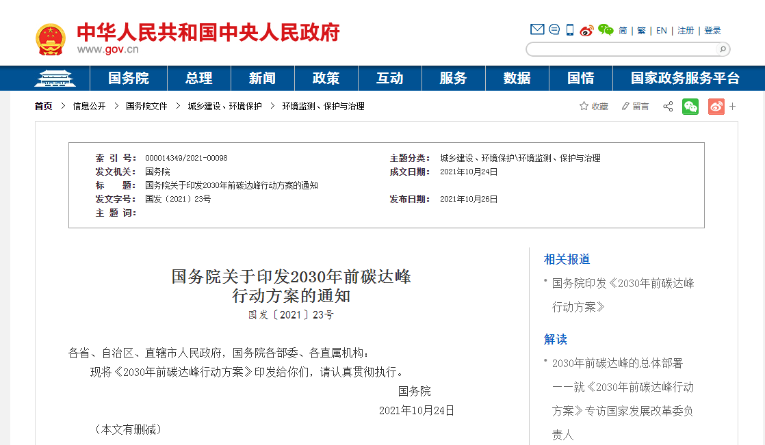 近日,國務(wù)院發(fā)布了《國務(wù)院關(guān)于印發(fā)2030年前碳達峰行動方案的通知》。目標是到2025年,非化石能源消費比重達到20%左右,單位國內(nèi)生產(chǎn)總值能源消耗比2020年下降13.5%,單位國內(nèi)生產(chǎn)總值二氧化碳排放比2020年下降18%,為實現(xiàn)碳達峰奠定堅實基礎(chǔ)。到2030年,非化石能源消費比重達到25%左右,單位國內(nèi)生產(chǎn)總值二氧化碳排放比2005年下降65%以上,順利實現(xiàn)2030年前碳達峰目標。